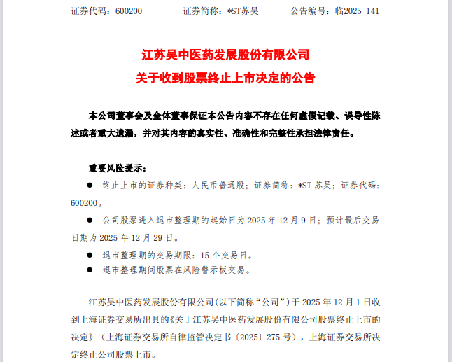公告显示,*ST苏吴于当日收到上交所出具的《关于江苏吴中医药发展股份有限公司股票终止上市的决定》,上交所决定终止公司股票上市。公司股票进入退市整理期的起始日为2025年12月9日,交易期限为15个交易日,预计最后交易日期为2025年12月29日;首个交易日无价格涨跌幅限制,此后每日涨跌幅限制为10%。