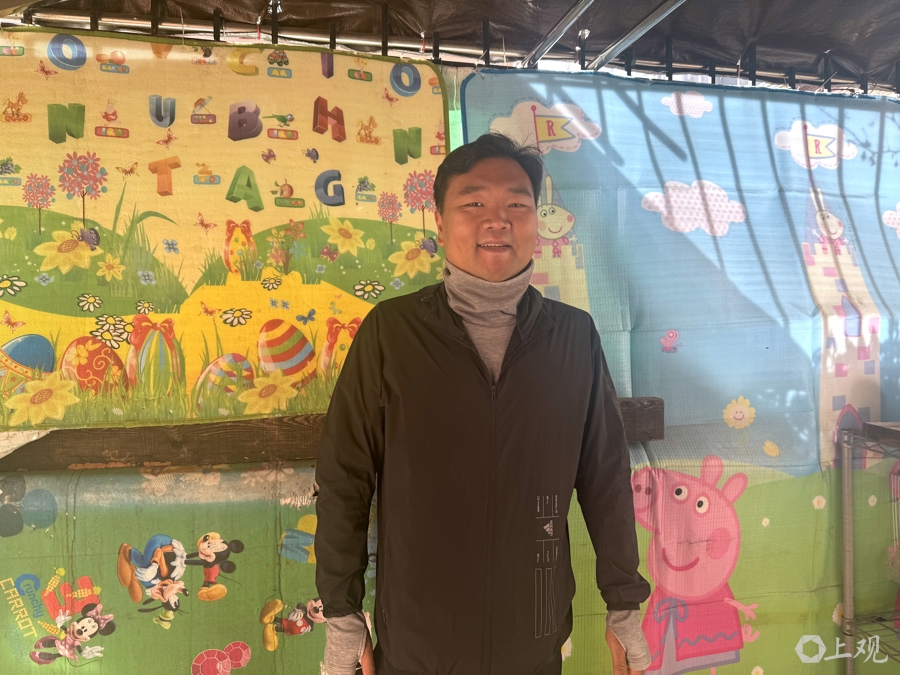 杨臻在江南新村家中的院子里,背景是他为女儿贴的卡通画。 舒抒 摄