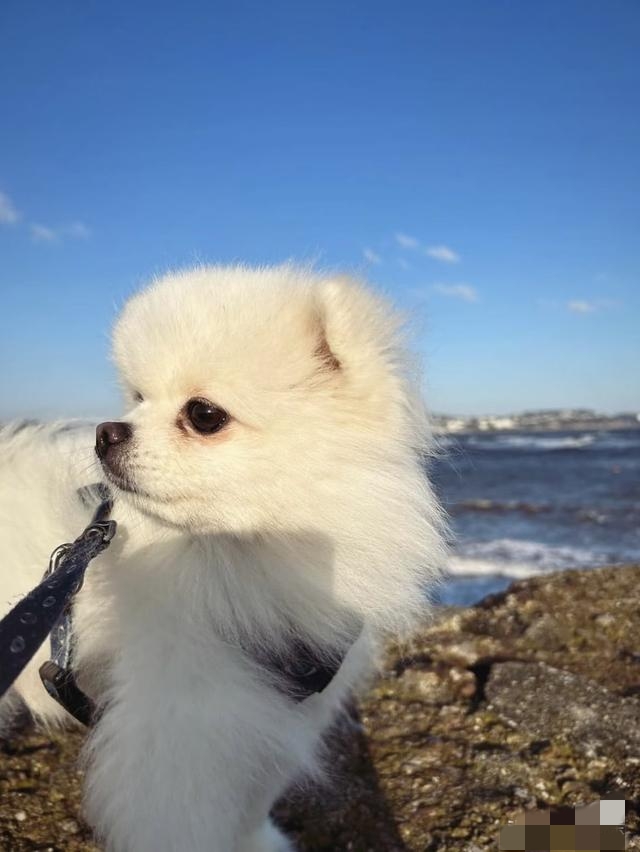 她的宠物狗,一只白色博美,蹲在海边的礁石上。圣诞甜点桌上摆着粉色苹果酥和小雪人巧克力。节日气氛浓厚。