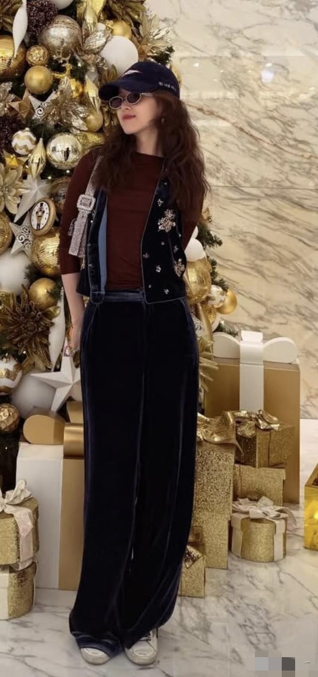 仿佛这双鞋已经穿了很多天。金色圣诞树前,她戴着棒球帽和墨镜。
